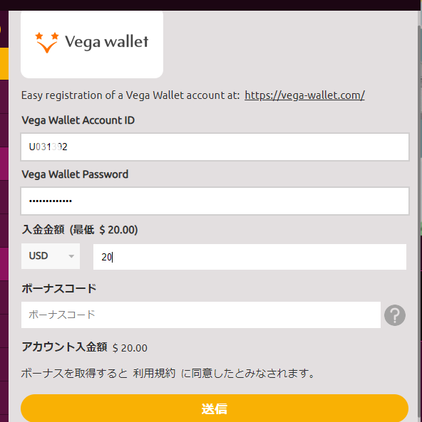 2.Uから始まるベガウォレットのアカウントID、ベガウォレットのパスワード、入金額を入力し『送信』をクリック。