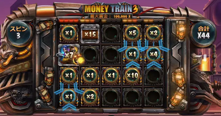 Money Train3 のフリースピンでは、3回のチャンスで倍率が表示されている絵柄を揃え、最終的に配当額×〇倍というのが賞金になります。